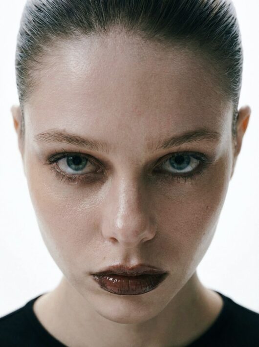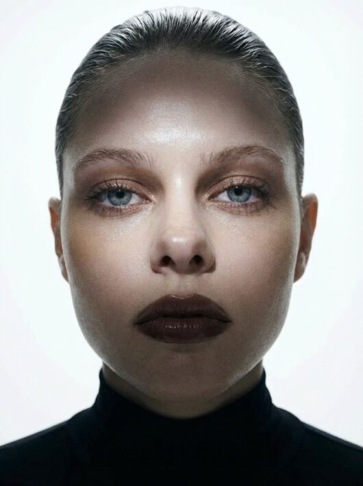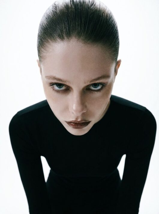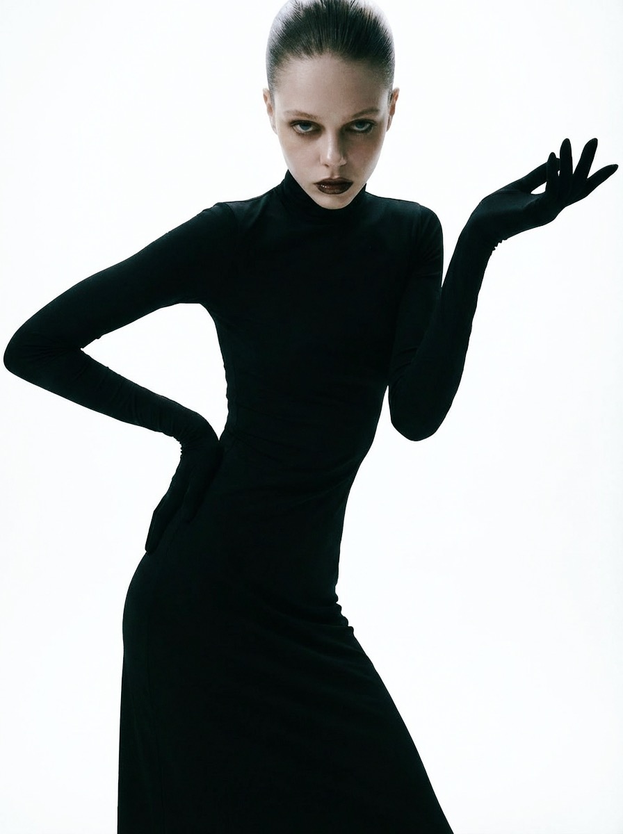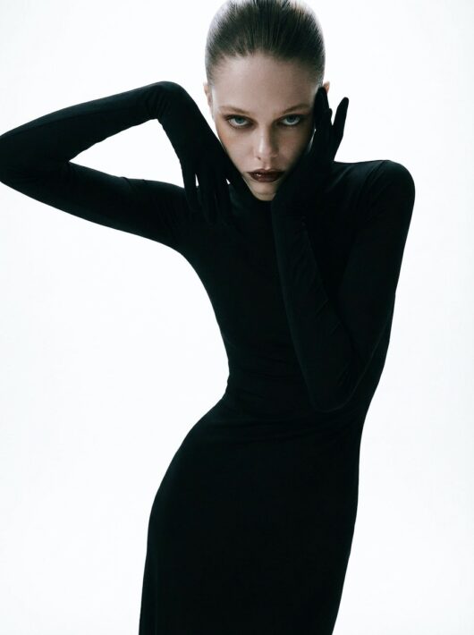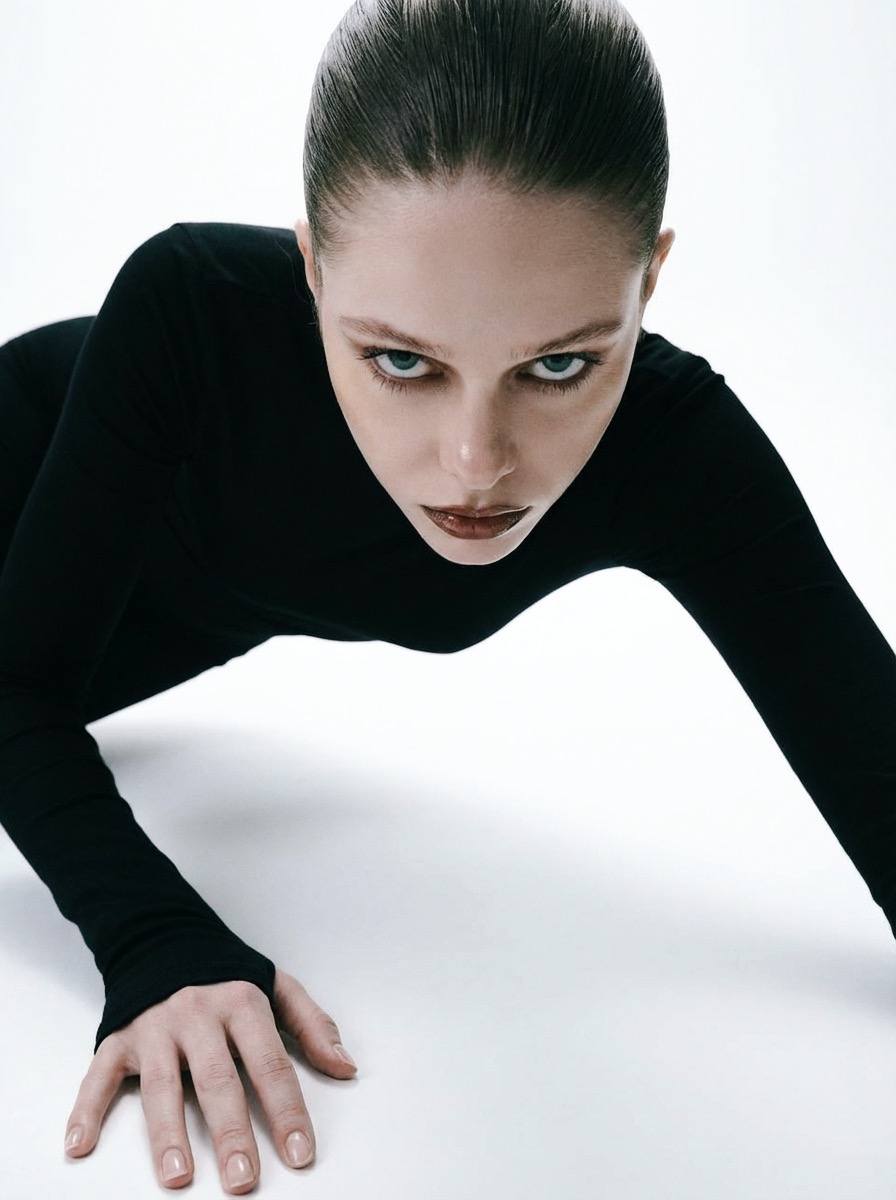 The shoot is built on contrast: cold aesthetics, an almost sterile space, and an emotionally charged gaze. Each pose feels like a frozen frame from a film, where the body becomes form, and form becomes a statement.